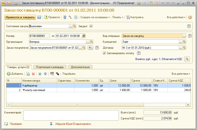 Для обеспечения процесса закупок товаров и работы с поставщиками в программном продукте 1С: Автосервис автоматизировано ряд операций: