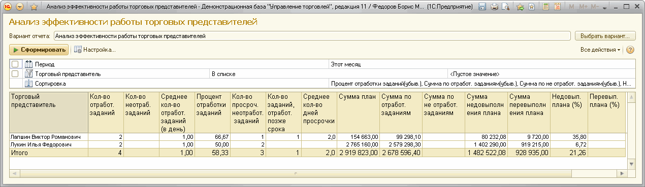 Анализ деятельности торговых представителей производится с помощью различных отчетов: можно сравнить деятельность торговых представителей с точки зрения эффективности их работы, а также провести план-фактный анализ деятельности торговых представителей.
