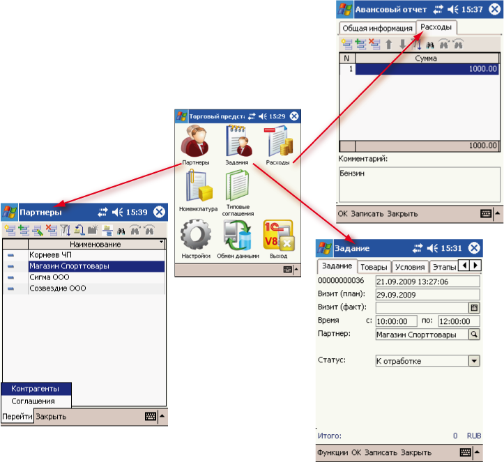На основе Расширения для карманных компьютеров реализовано приложение, автоматизирующее работу торгового представителя на КПК. Приложение осуществляет обмен данными с информационной базой конфигурации "Управление торговлей" и позволяет просматривать на КПК полученные задания, отмечать их отработку, просматривать остатки товаров, принимать у клиентов заказы, заполнять авансовые отчеты.
