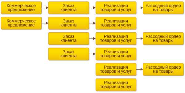 В программе полностью отслеживаются процессы продаж. При этом продажи можно оформлять как по полному циклу оформления продажи (начиная с момента согласования коммерческого предложения на основании данных о первичном интересе клиента в оформленной с ним сделке), так и без предварительно оформленных коммерческих предложений и заказов клиентов, по так называемой "упрощенной схеме". Возможные схемы документооборота продаж представлены на рисунке.