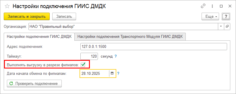 В настройке подключения с ГИИС ДМДК установить флаг «Выполнять выгрузку в разрезе филиалов» и указать дату начала обмена по филиалам: