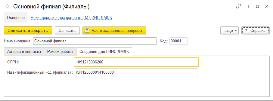 В карточке филиалов указать ОГРН организации и идентификационный код: