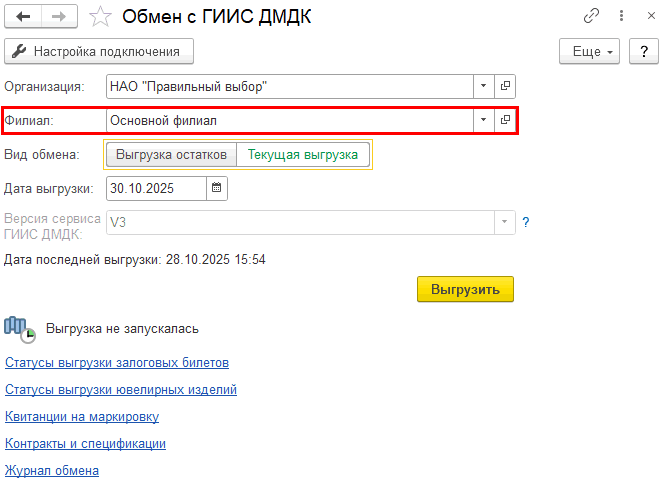Пример: обмен включен с 01.09.2025 — билеты, созданные до 01.09.2025, выгружаются по основной организации. Обмен отключен с 15.10.2025 — все, что создано до 15.10.2025, продолжает выгружаться по филиалам; созданное после 15.10.2025 — по основной организации.
