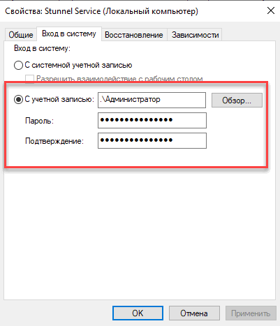 Выбрать службу Stunnel Service, установить для неё тип запуска «Автоматически», вход в систему с учетной записью созданного пользователя. Запустить службу.
