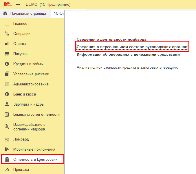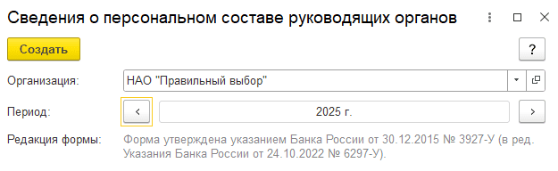 Шаг 1. Перейдите в меню «Отчетность в Центробанк», а затем откройте «Сведения о персональном составе руководящих органов»: