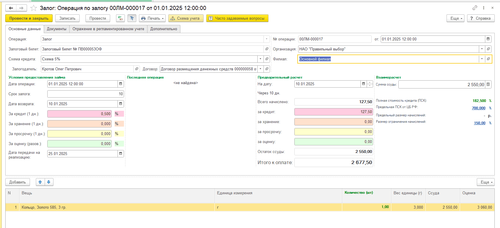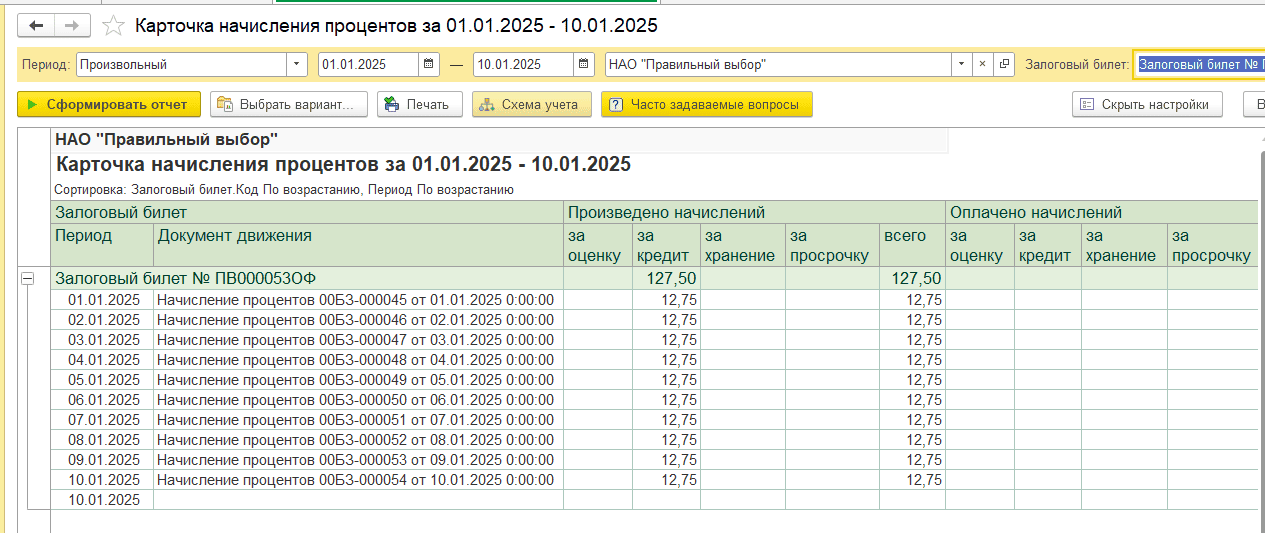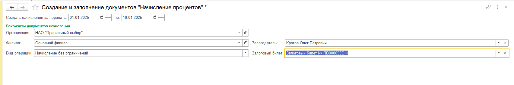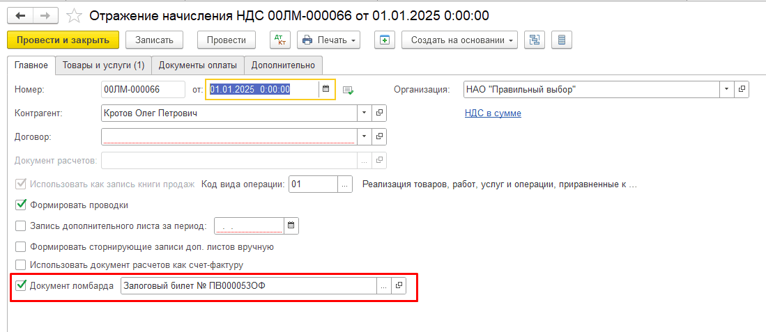 В созданных документах «Отражение начисления НДС» должен быть установлен флаг «Документ ломбарда» и заполнена ссылка на залоговый билет: