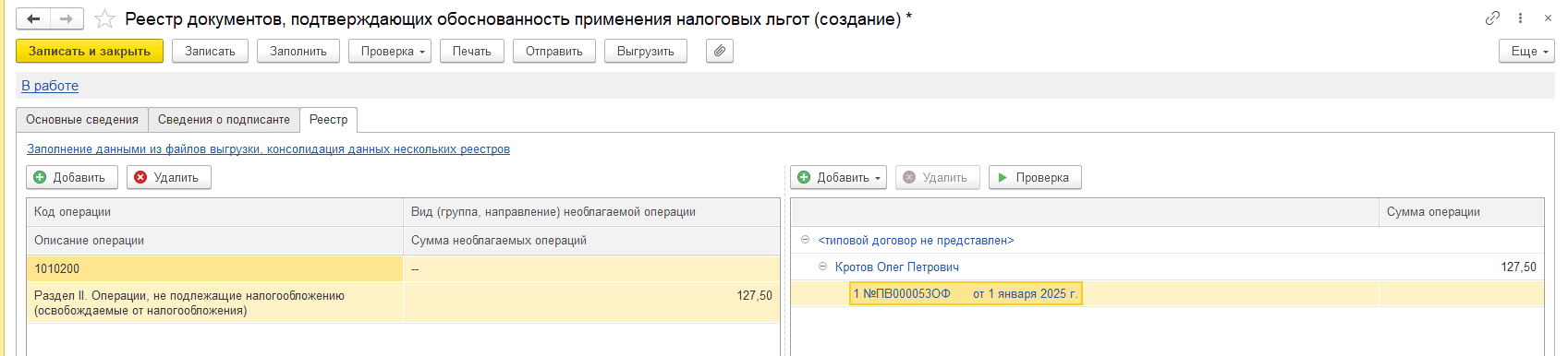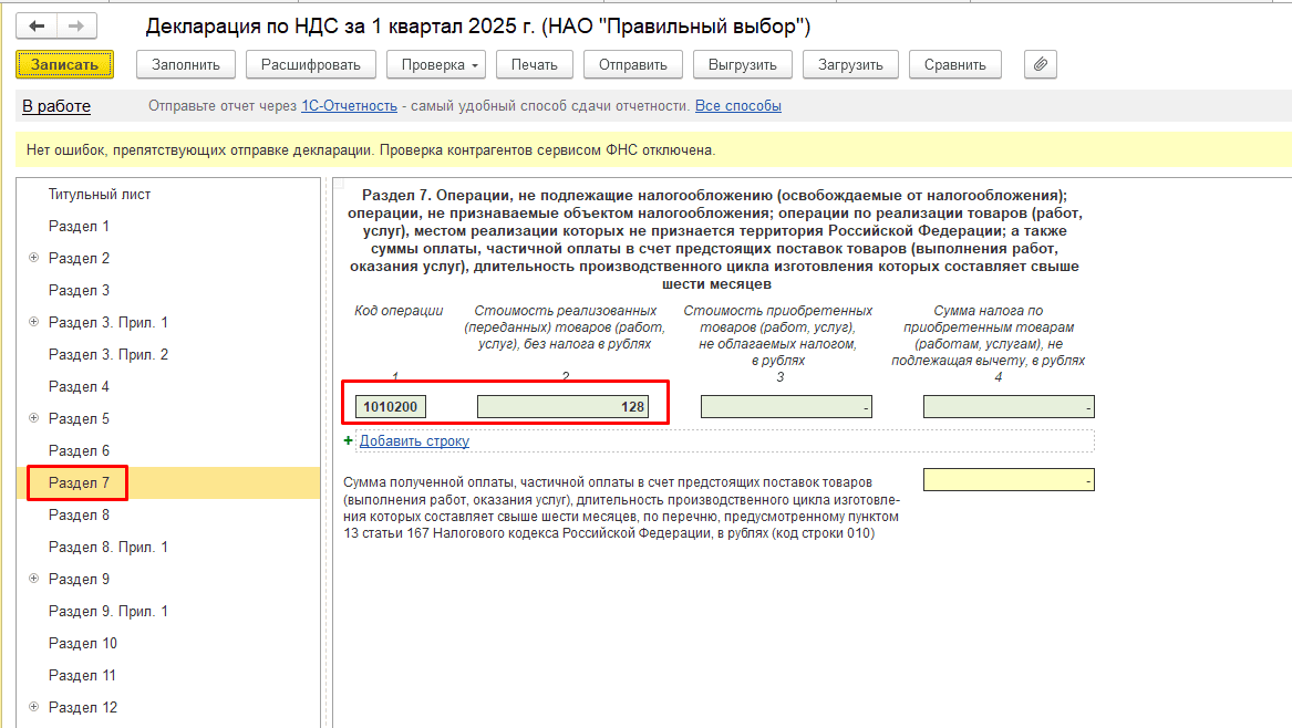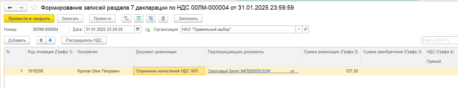 Создадим документ «Формирование записей раздела 7 декларации по НДС». Заполним документ по кнопке «Заполнить»: