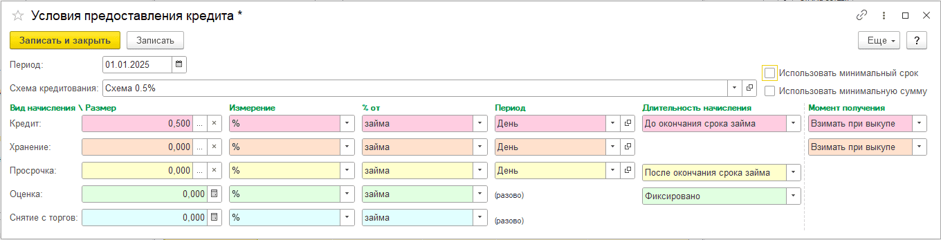 Настроим схему кредитования (меню «Ломбард – Настройки кредитования – Схемы кредитования»), установив размер начислений за кредит, например, 0,5% в день:
