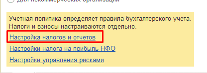 Откроем меню «Главное → Настройки → Учетная политика», нажмем ссылку «Настройка налогов и отчетов»: