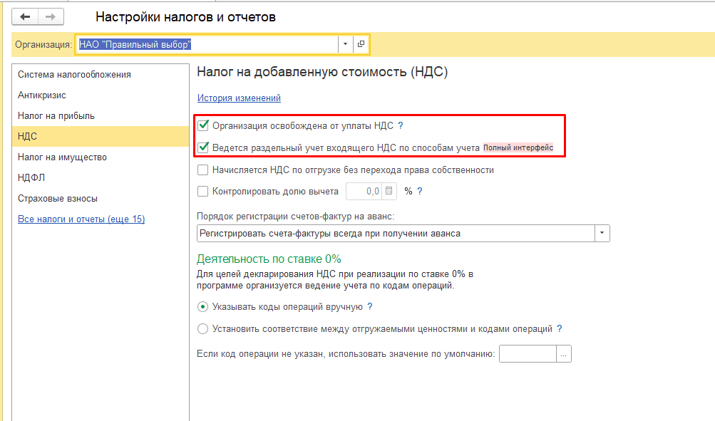 На вкладке «НДС » установим флажки «Организация освобождения от уплаты НДС» и «Ведется раздельный учет входящего НДС по способам учета»: