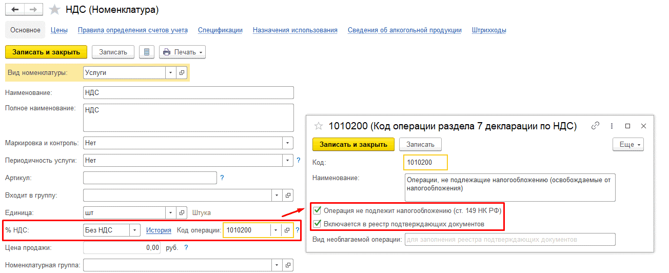 В поле «Номенклатура начисления НДС» создадим услугу, по которой будет отражаться НДС по процентам. Ставку НДС укажем «Без НДС», а в поле «Код операции» выберем код освобождаемой операции 1010200: