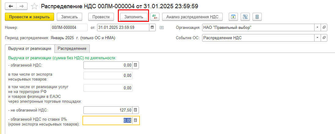 Перейдем в меню «Операции – Закрытие периода – Регламентные операции НДС» и создадим документ «Распределение НДС»
