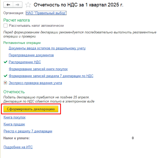В меню «Отчеты → 1С-Отчетность → Регламентированные отчеты» создадим и заполним отчет «Декларация по НДС» за 1 квартал 2025 года: