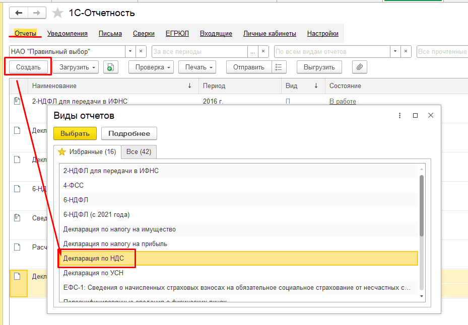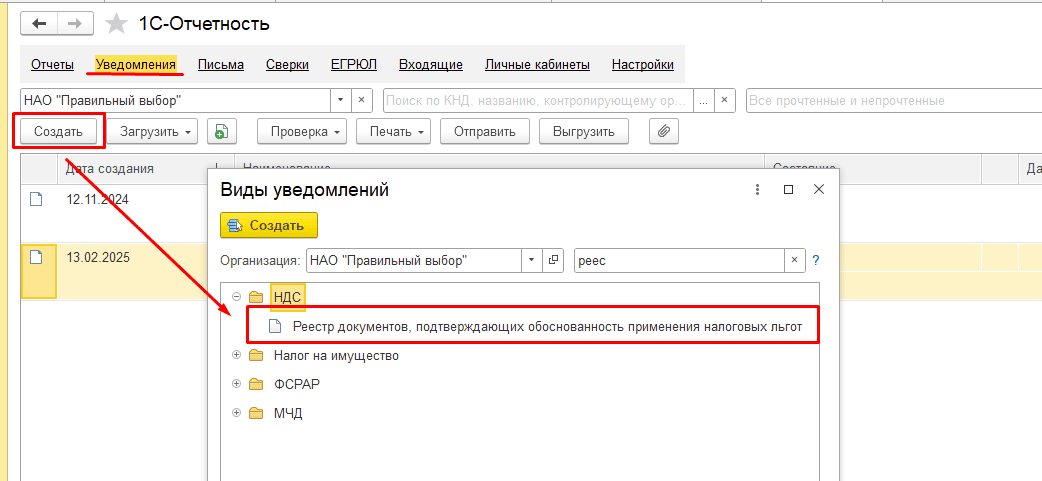 Перейдем в меню «Отчеты → 1С-Отчетность → Регламентированные отчеты» на закладку «Уведомления». По кнопке «Создать» выберем «Реестр документов, подтверждающих обоснованность применения налоговых льгот»: