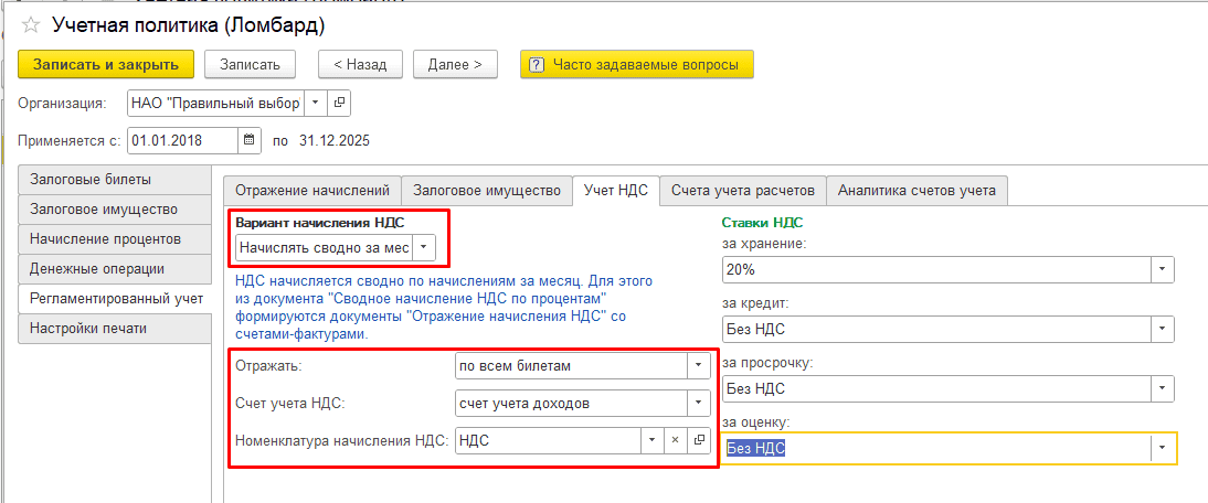 Откроем учетную политику по ломбарду (меню «Главное → Настройки по ломбарду → Учетная политика») и на закладке «Регламентированный учет → Учет НДС» установим следующие настройки: