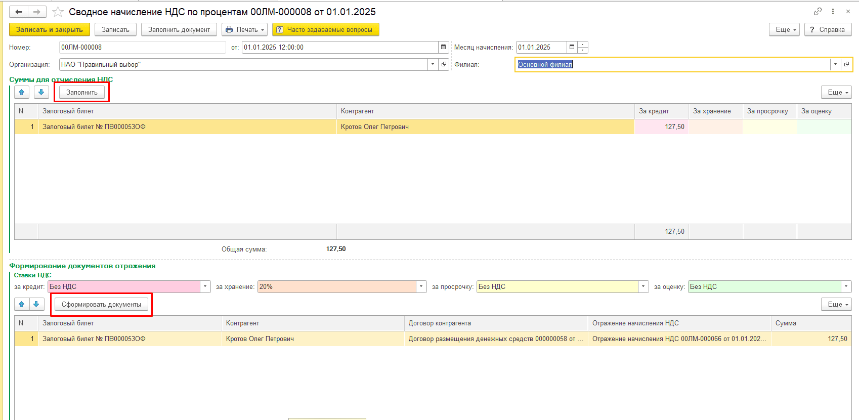 Создадим и заполним документ «Сводное начисление НДС по процентам» с видом операции «Раздельное отражение НДС» (меню «Ломбард → Регламентные операции»). В разделе «Формирование документов отражения» нажмем на кнопку «Сформировать документы»: