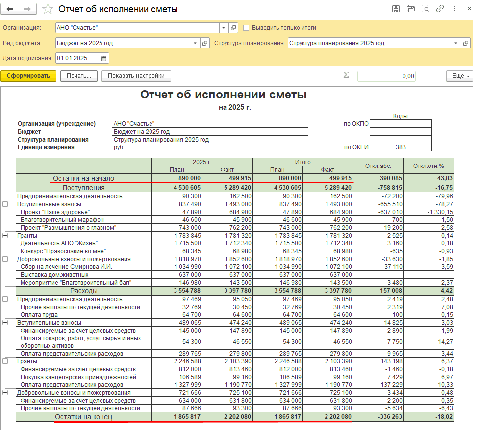 Для сравнения плановых и фактических показателей сметы, в т.ч. по остаткам, используется отчет об исполнении сметы: