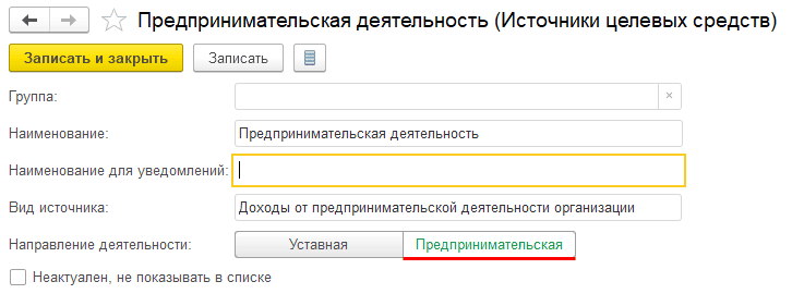 Пример статьи расхода по источнику «Предпринимательская деятельность»: