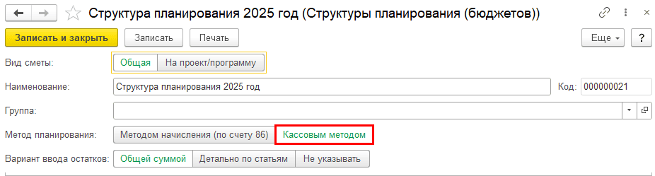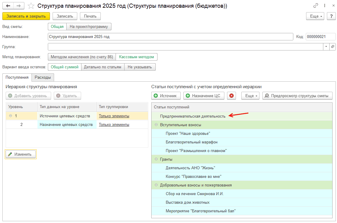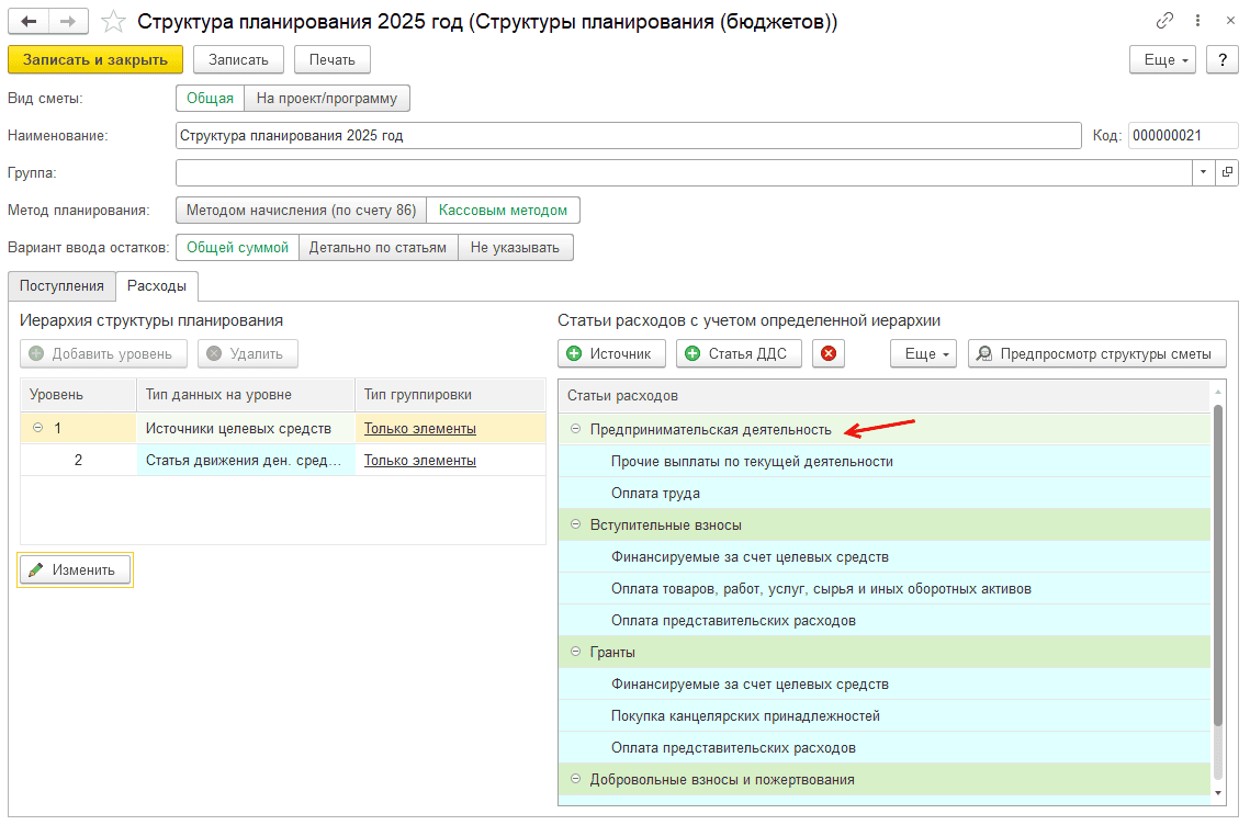 Статьи структуры планирования по источнику финансирования с направлением деятельности – Предпринимательская оформляются при Кассовом методе планирования.