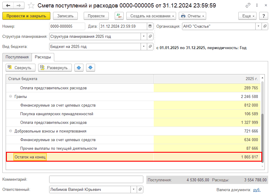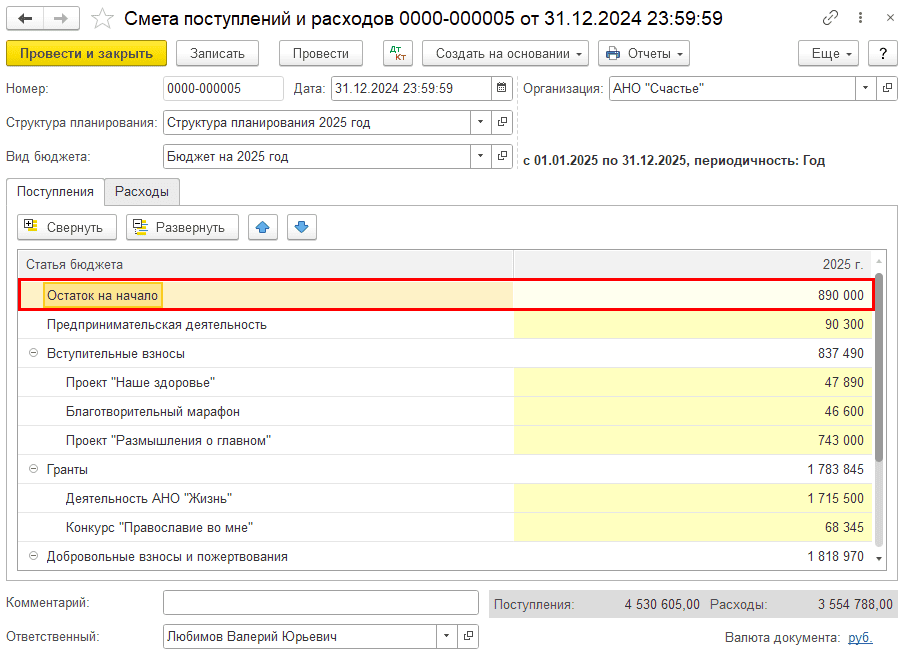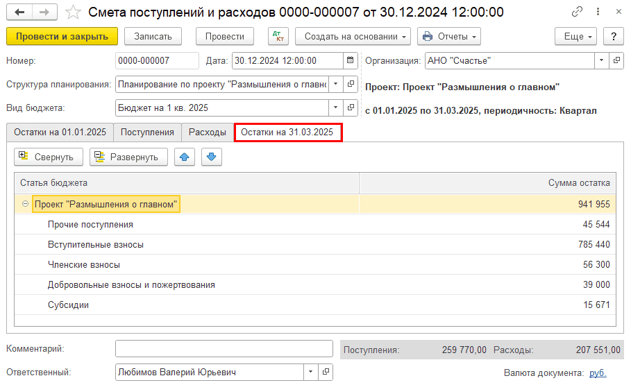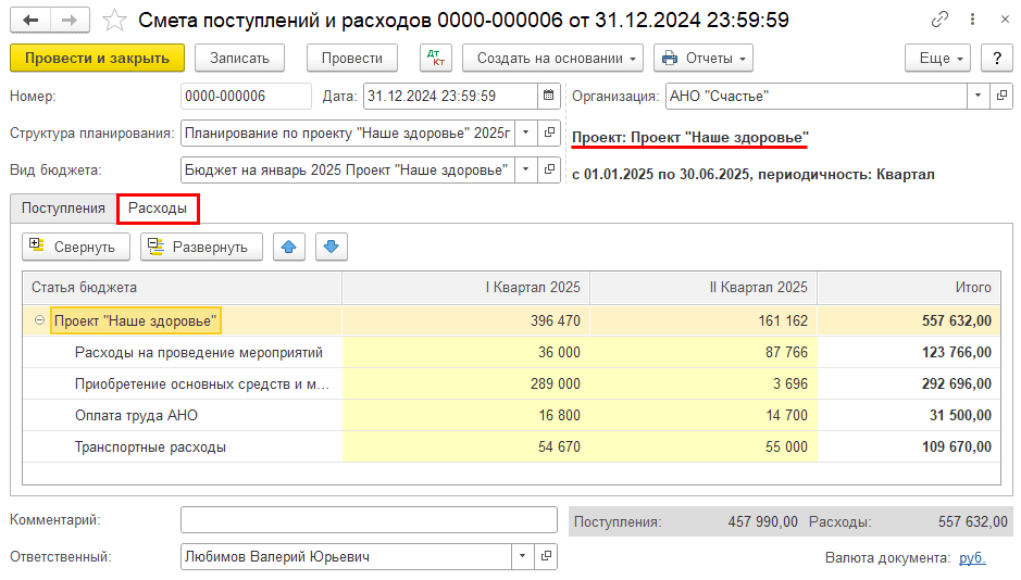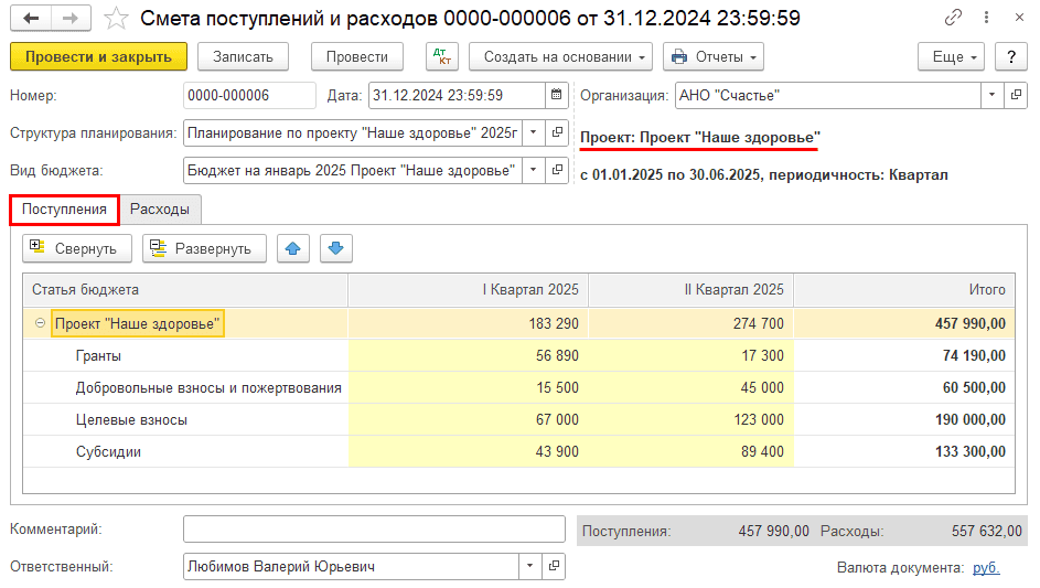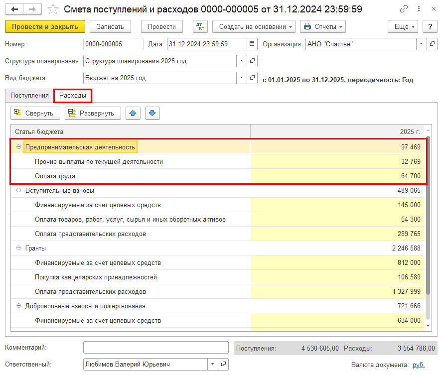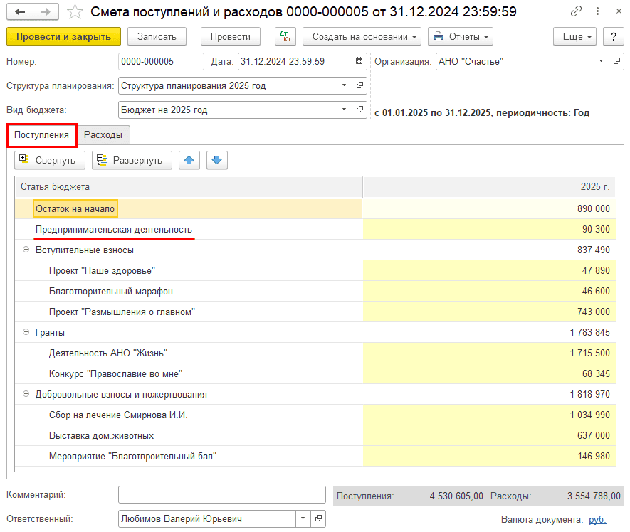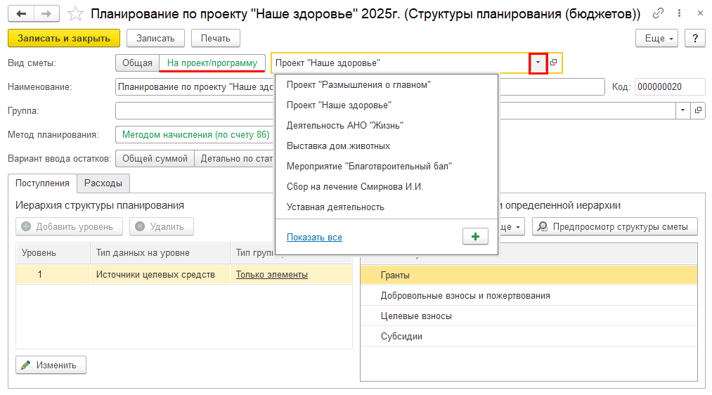 Формируются сметы на конкретные проекты, программы и мероприятия некоммерческой организации.