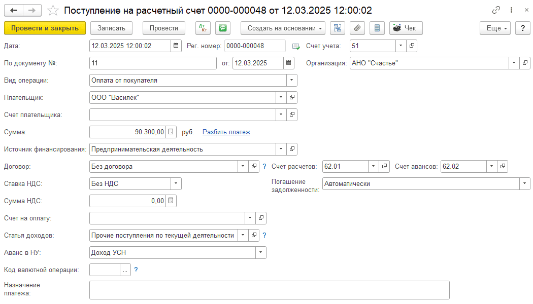 Плановые и фактические поступления и выплаты денежных средств по операциям, не относящимся к целевому финансированию, отражаются по источнику Предпринимательская. Такие операции оформляются операциями «Оплата от покупателя», «Возврат покупателю» и т.п.