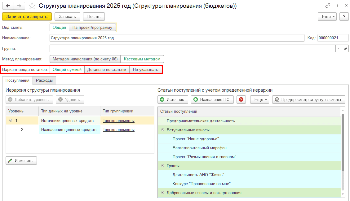 При варианте ввода остатков в структуре планирования «детально по статьям» наряду с поступлениями и расходами добавлена вкладка «Остатки», где также можно настроить уровни иерархии по остаткам с выбором Источников ЦС и Назначения ЦС: