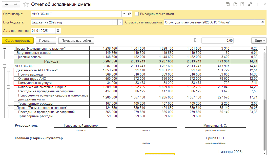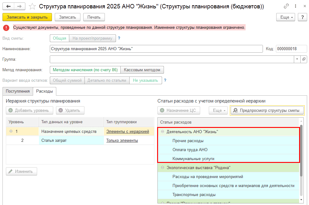Например: Статья расходов по назначению ЦС Деятельность АНО «Жизнь» собирается в соответствии со структурой планирования по нескольким статьям затрат: «Прочие расходы», «Оплата труда АНО» и «Коммунальные услуги».
