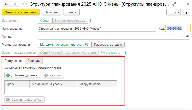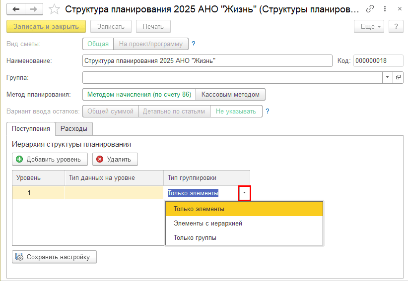 Шаг 3. Определите уровни структуры и выберите статьи поступлений и расходов.