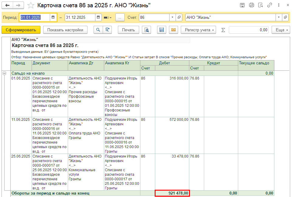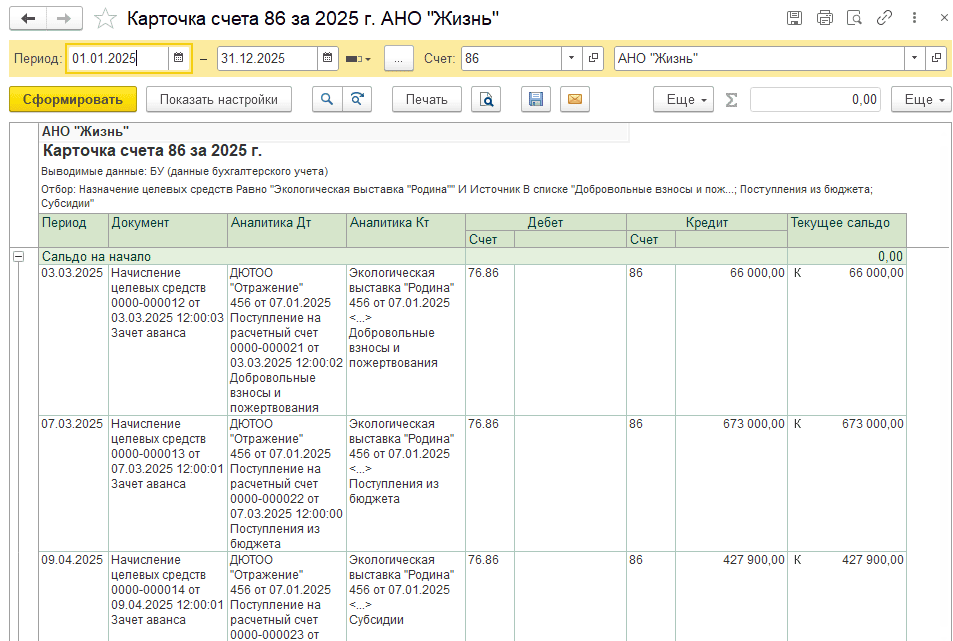 Карточка 86 счета: