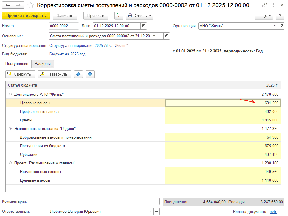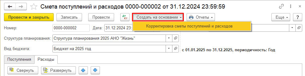 Если требуется скорректировать смету, на основании документа «Смета поступлений и расходов» создайте документ «Корректировка сметы поступлений и расходов»: