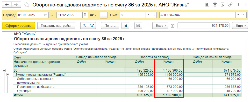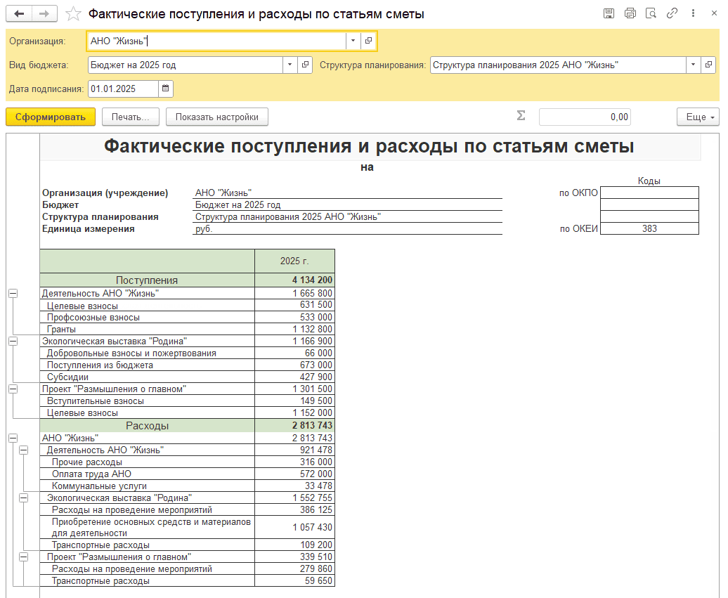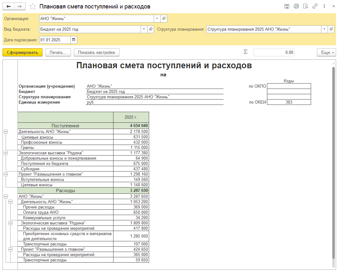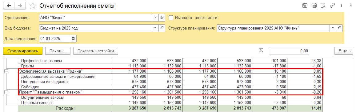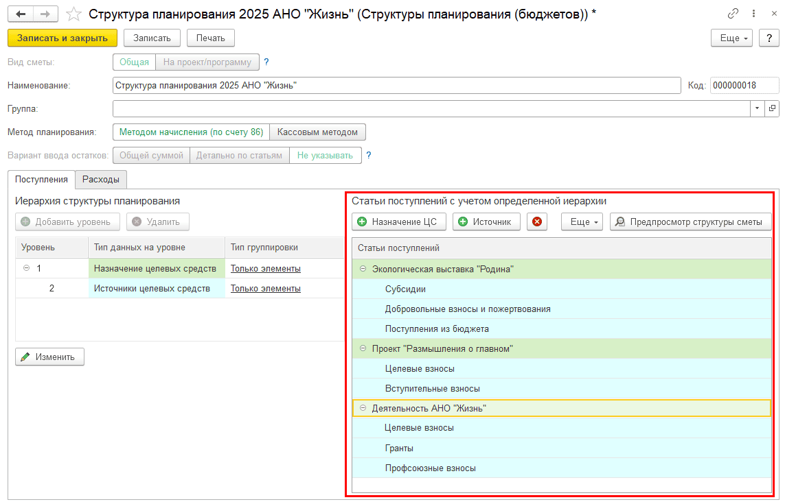 Например: Статья поступления по назначению ЦС Экологическая выставка «Родина» собирается в соответствии со структурой планирования по нескольким источникам: «Добровольные взносы и пожертвования», «Поступления из бюджета» и «Субсидии»: