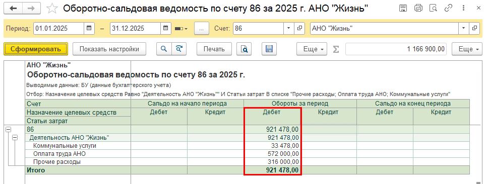 Оборотно-сальдовая ведомость по Дебету 86 счета: