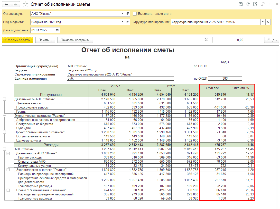 В отчет выводятся плановые данные по выбранной структуре планирования и виду бюджета и собираются фактические данные в соответствии с составом статей поступлений и расходов, заданных в указанной структуре.