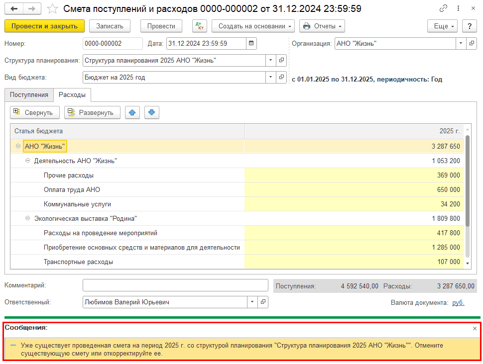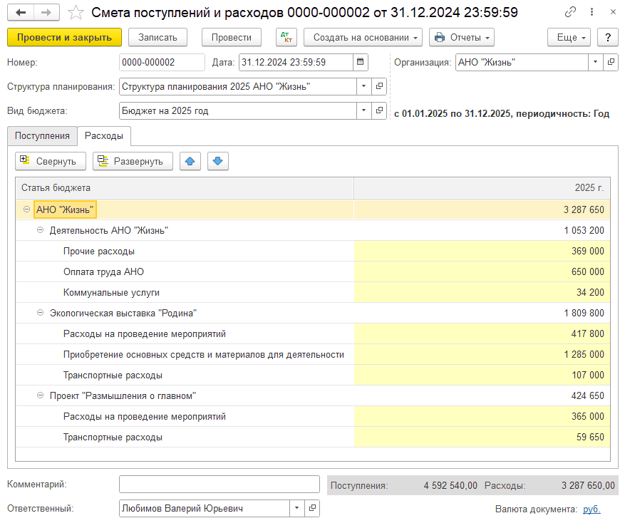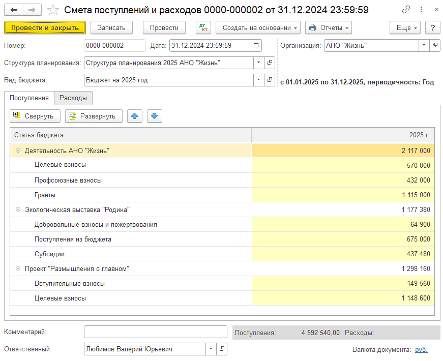 На основании созданного вида бюджета и заданной структуры планирования сформируйте Смету поступлений и расходов.