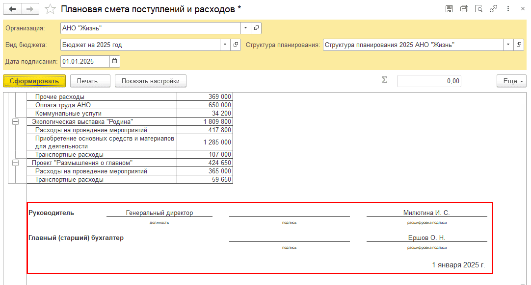 Стандартно в подписи отчета выводятся руководитель и главный бухгалтер, указанные в карточке организации:
