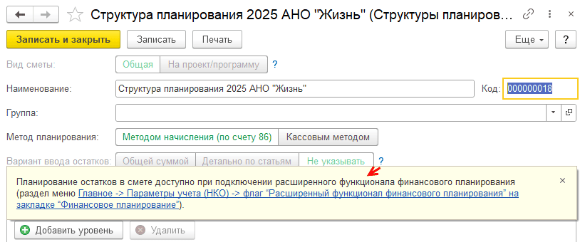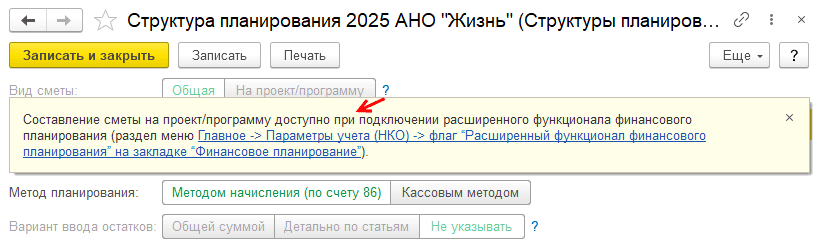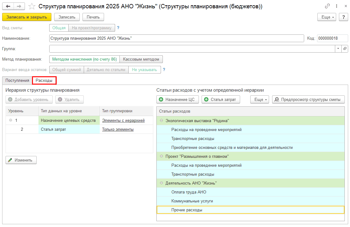 Вид сметы – определяет, создается ли смета для конкретного проекта, программы или мероприятия некоммерческой организации (доступно в расширенном функционале финансового планирования, в обычной версии только Общая смета):