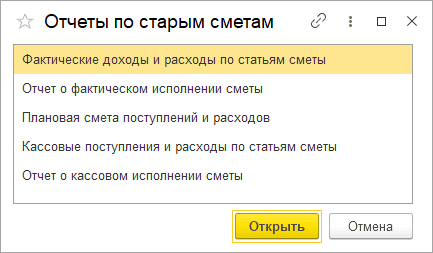 Отчеты по старым сметам – прежние отчеты, которые можно сформировать по сметам поступлений и расходов, оформленным до релиза 5.0.117.1: