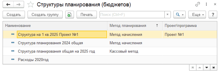 В справочнике «Структуры планирования(бюджетов)» указываются статьи расходов и поступлений, которые затем войдут в смету: