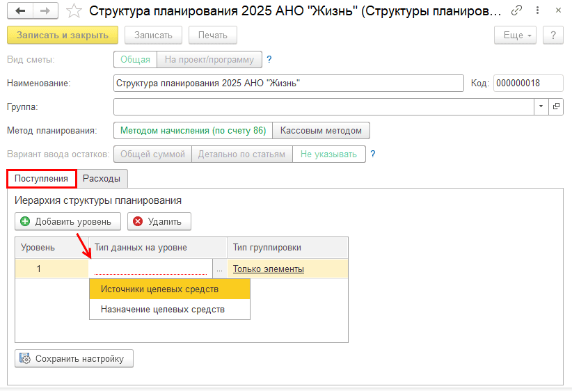 Пример: Если при методе начисления выбран первый уровень – Источник целевых средств, то на втором уровне будет Назначение целевых средств; и наоборот.