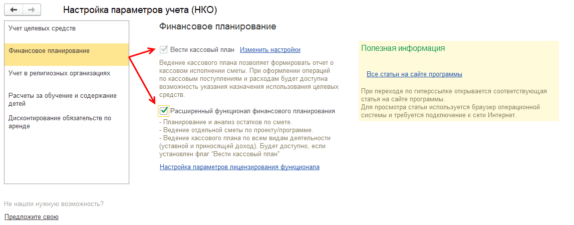 В программе 1С-Рарус: Бухгалтерия для некоммерческой организации 5 реализована возможность ведения кассового плана. Ведение кассового плана возможно как по уставной деятельности НКО, так и по источникам финансирования с направлением деятельности - Предпринимательская. (Доступно в расширенном функционале).