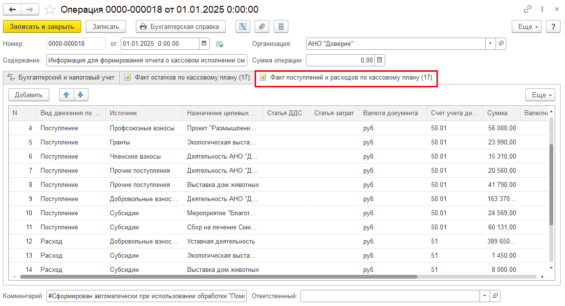 Вкладка по регистру накопления «Факт поступлений и расходов по кассовому плану»: