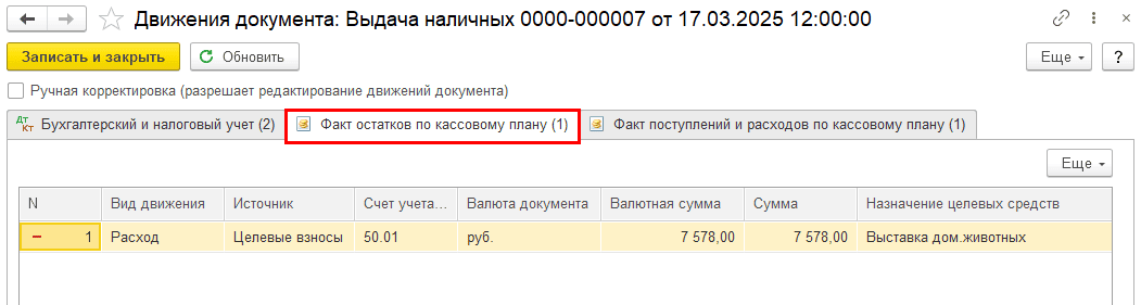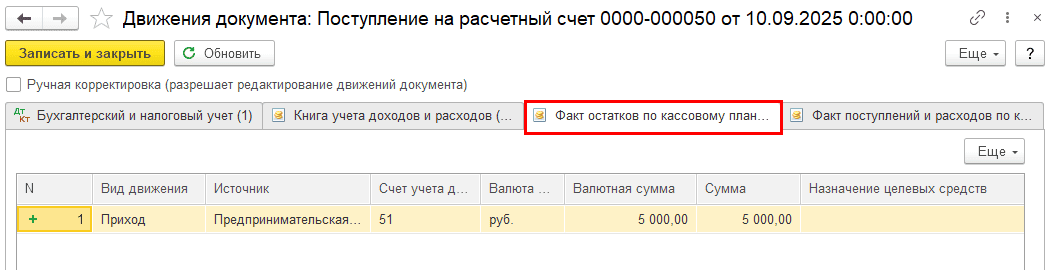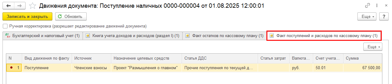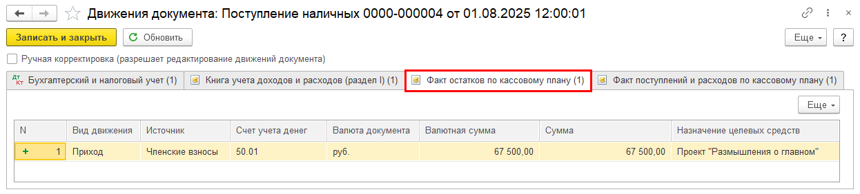 При проведении документов также формируются движения по специальным регистрам накопления «Факт поступлений и расходов по кассовому плану»:
