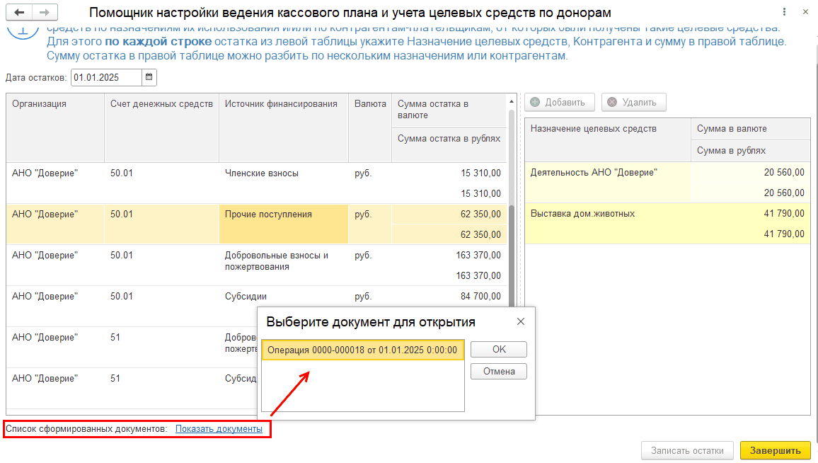 Если указывается для формирования остатков указывается уже прошедшая дата, то во всех документах движения денежных средств, начиная с даты, следующей за датой распределения остатков, и по текущую дату вручную заполните поля «Назначение целевых средств», «Донор» и перепроведите их