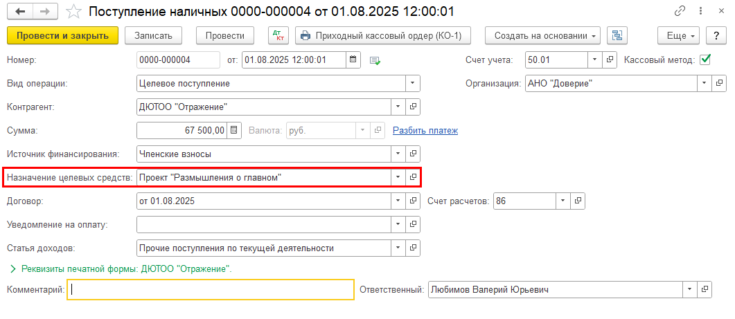 Шаг 4. Отразите факт поступления и списания целевых средств, например документ «Поступление наличных» с указанием назначения целевых средств:
