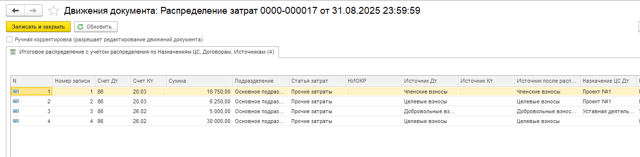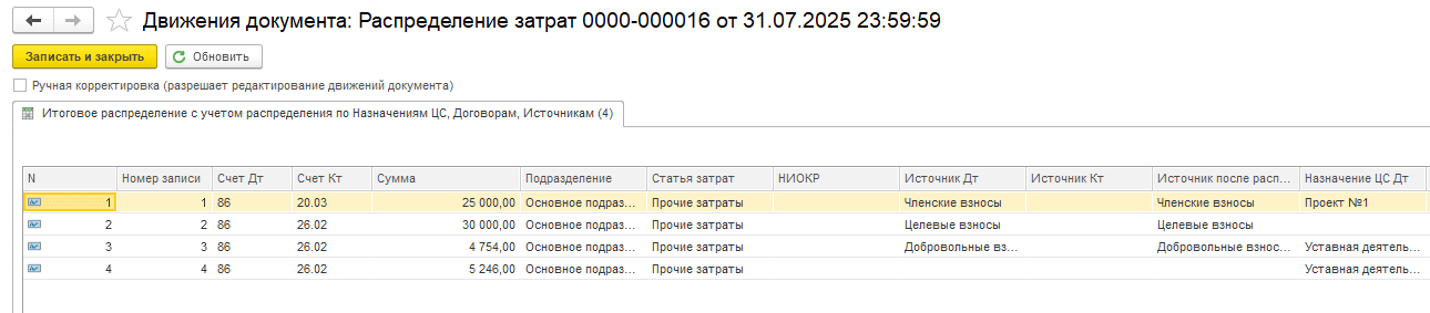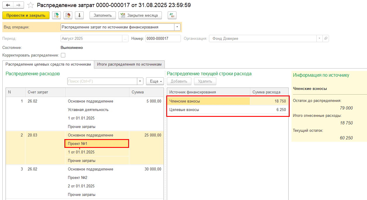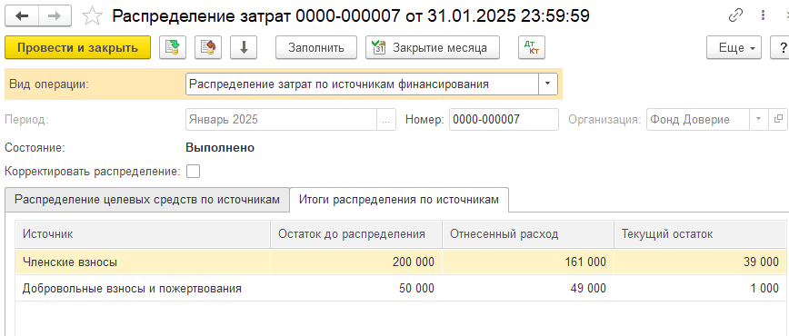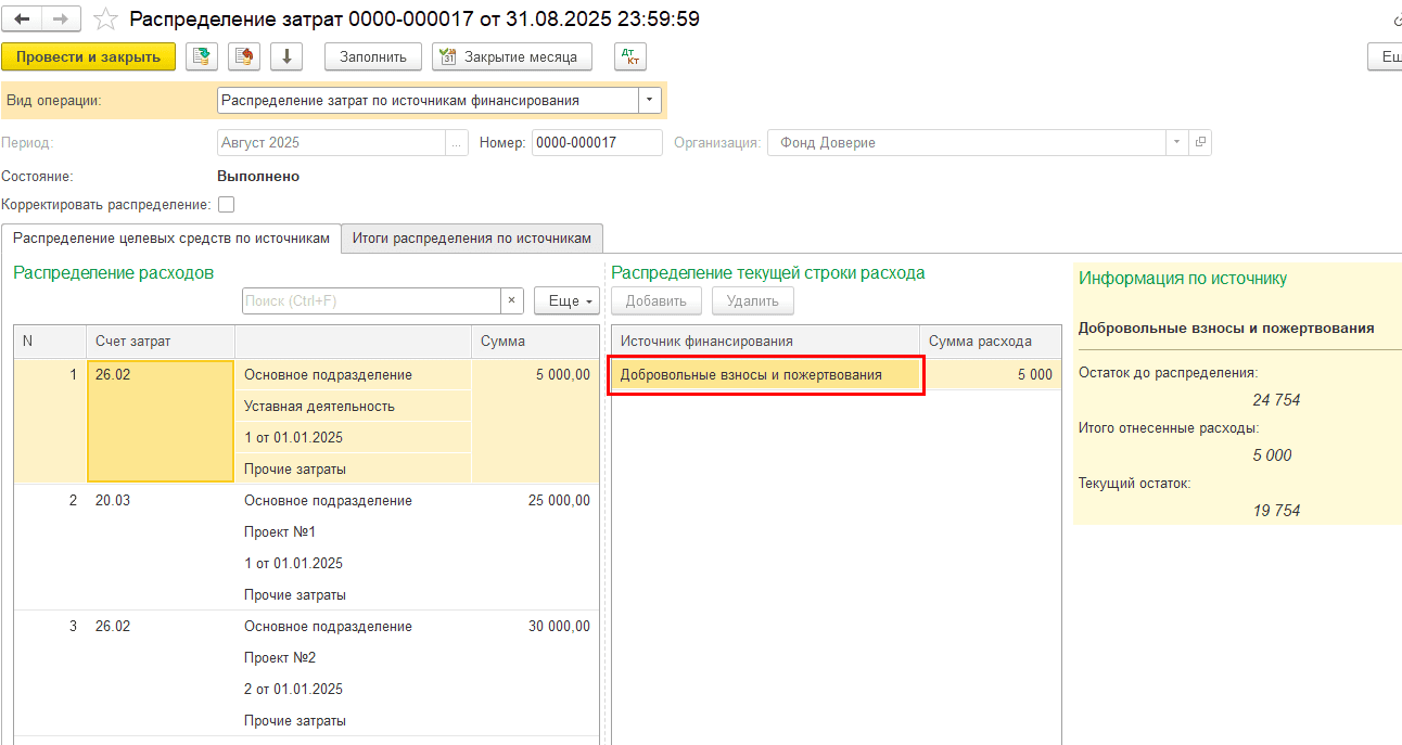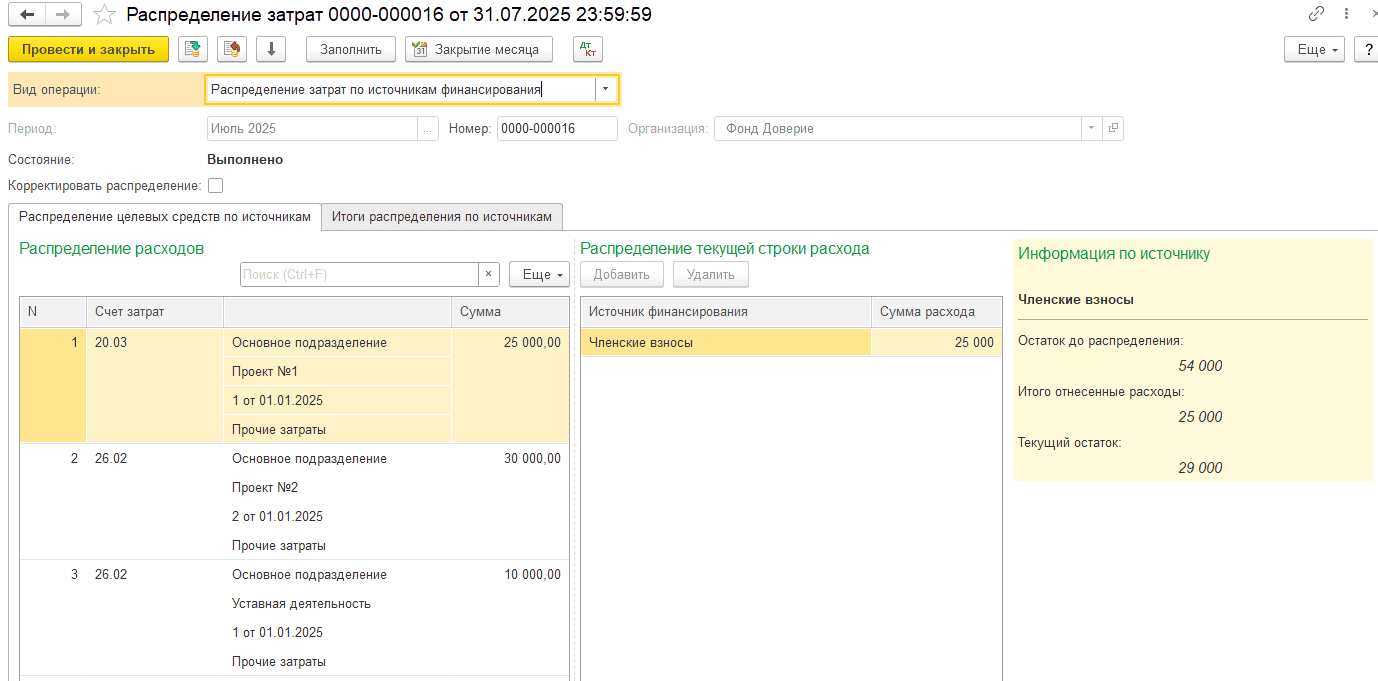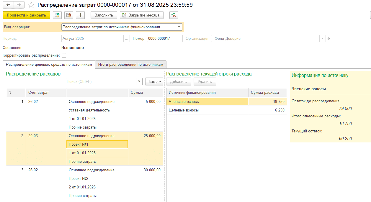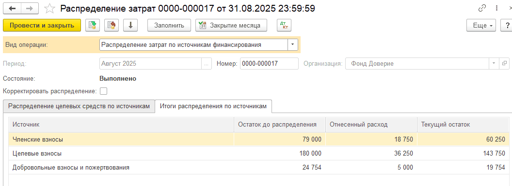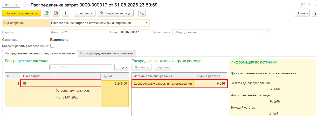 Когда в будущем поступят целевые средства для покрытия такого расхода, сумма будет распределена в следующем документе «Распределение расходов по источникам финансирования». Например, в августе 2025 года поступили целевые средства на Уставную деятельность по договору «1 от 01.01.2025» и источнику «Добровольные взносы и пожертвования». При распределении затрат сумма расхода, отраженная по дебету счета 86 с пустым источником в прошлом месяце, будет распределена на этот источник: