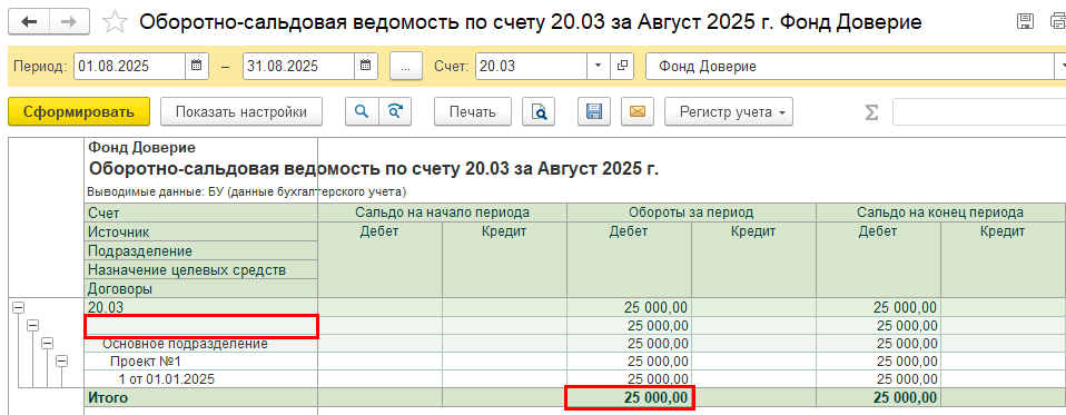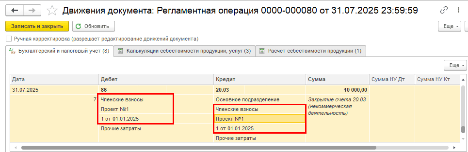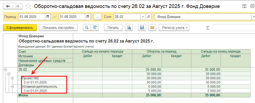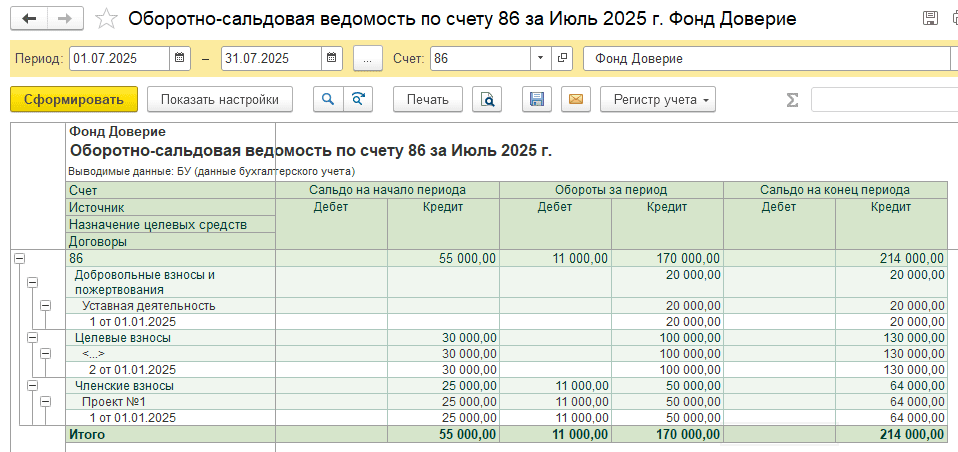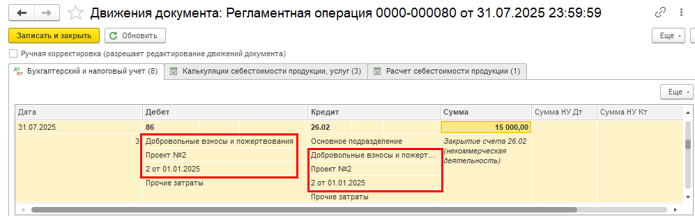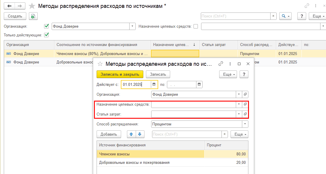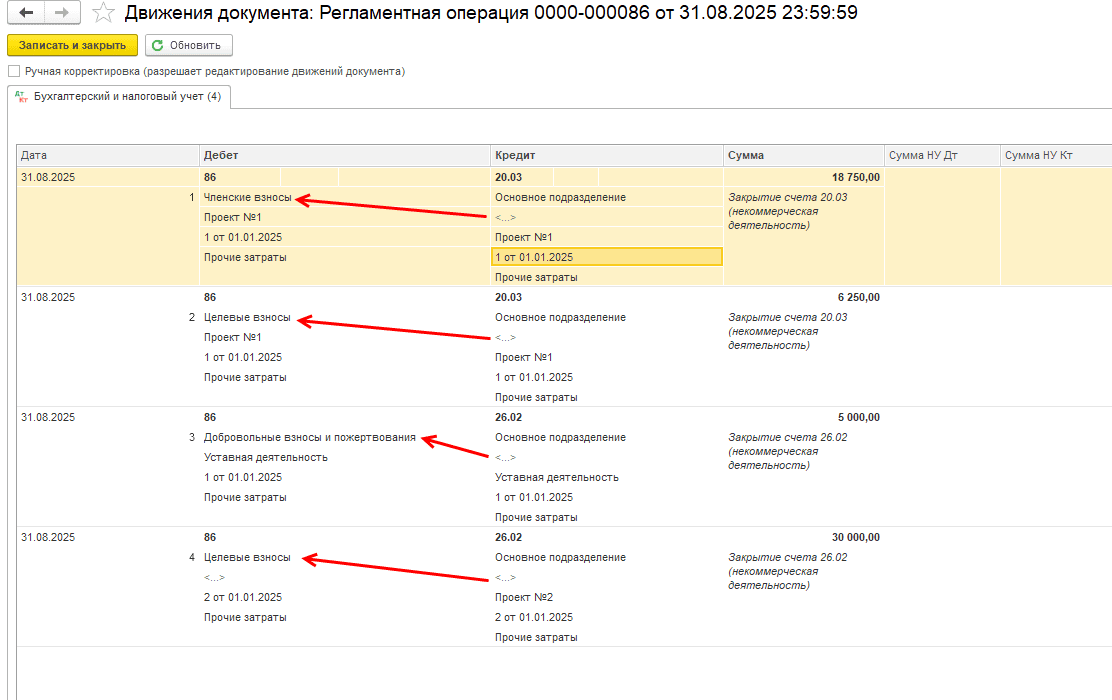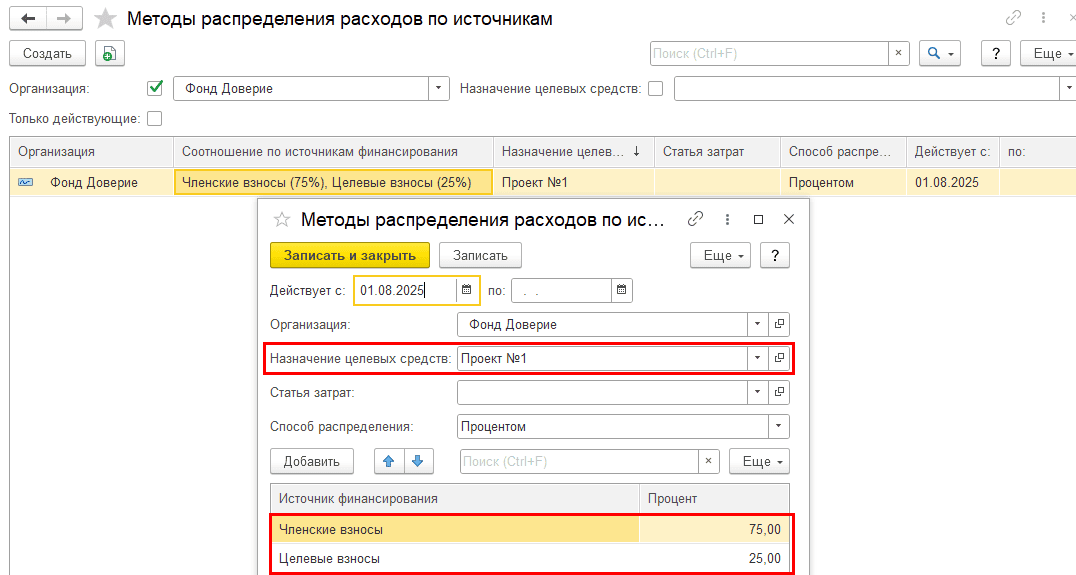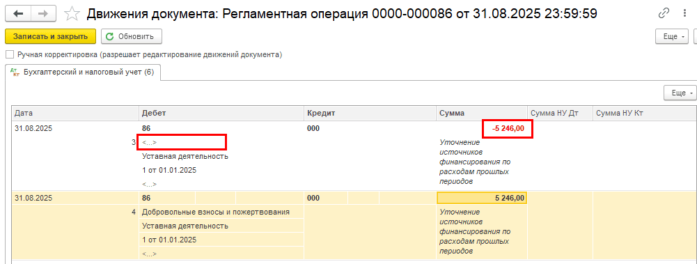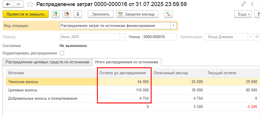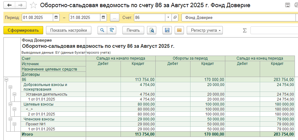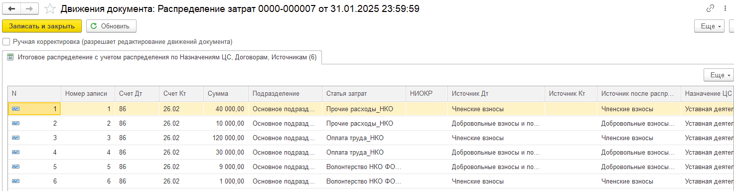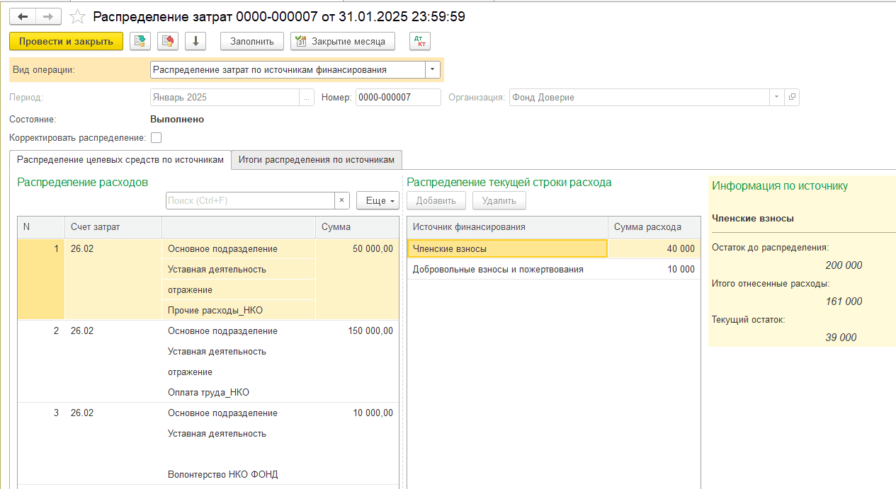 Когда в будущем поступят целевые средства для покрытия такого расхода, сумма будет распределена в следующем документе «Распределение расходов по источникам финансирования». Например, в августе 2025 года поступили целевые средства на Уставную деятельность по договору «1 от 01.01.2025» и источнику «Добровольные взносы и пожертвования». При распределении затрат сумма расхода, отраженная по дебету счета 86 с пустым источником в прошлом месяце, будет распределена на этот источник: