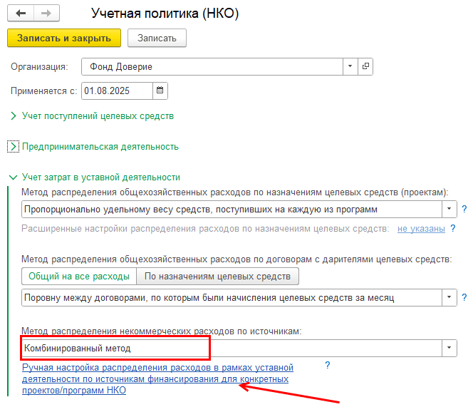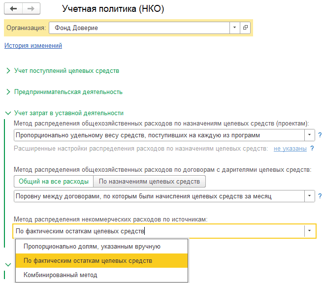В Учетной политике НКО в качестве метода распределения расходов по источникам выберите «Комбинированный метод»: