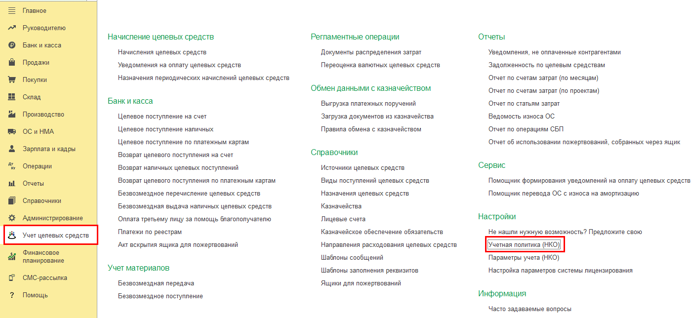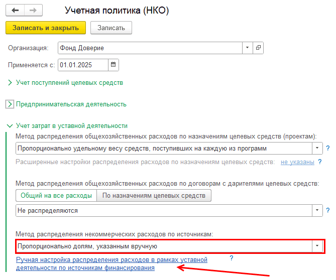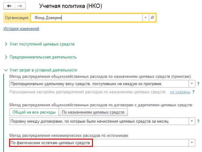 Способ распределения расходов по источникам задается в учетной политике НКО: «Учет целевых средств → Настройки → Учетная политика НКО»:
