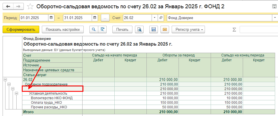 При закрытии месяца программа проверяет поступления по источнику «Добровольные взносы и пожертвования». Подходящих поступлений по этому источнику и назначению нет, поэтому сумма расхода списывается по аналитике, указанной в расходе.