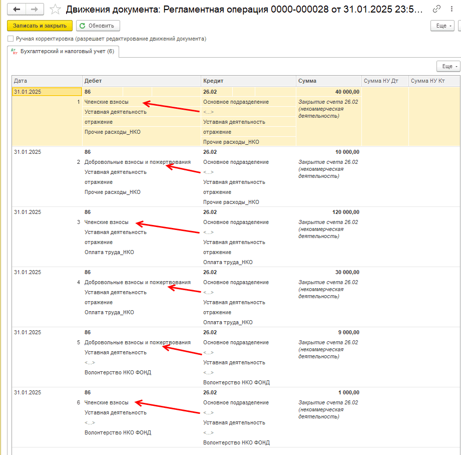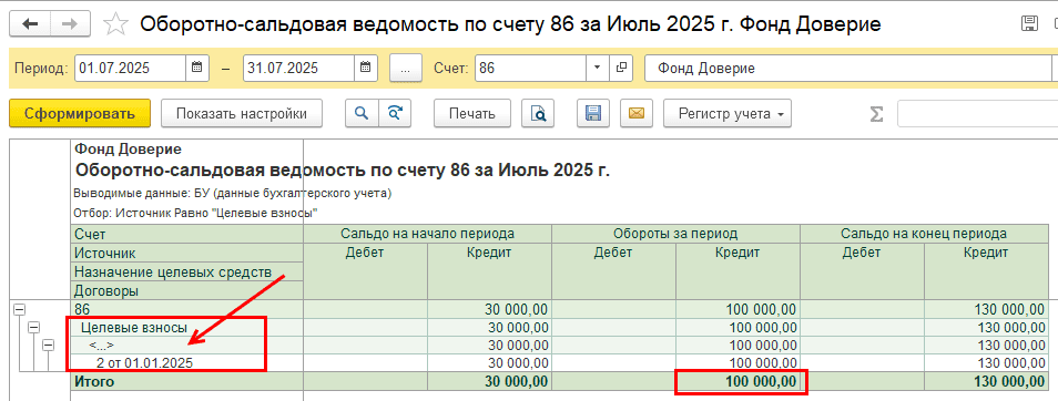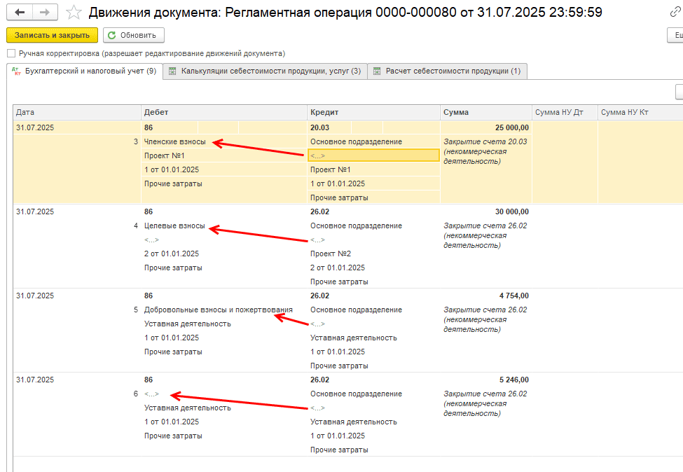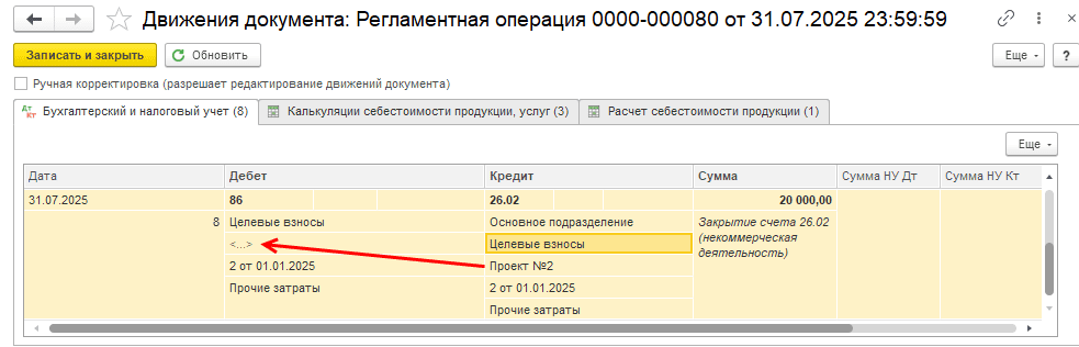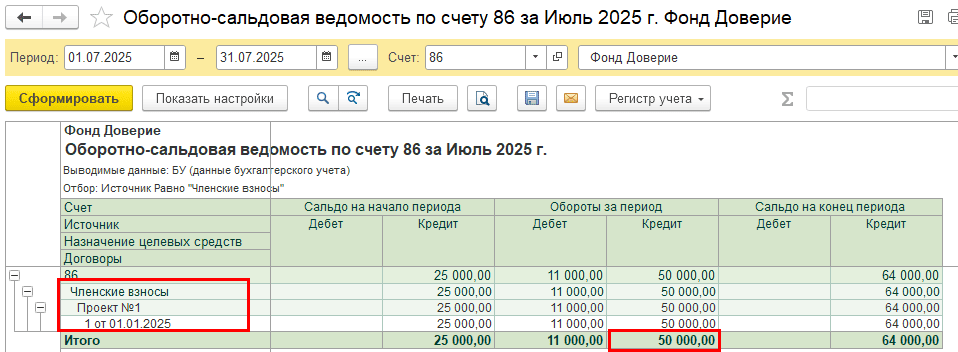 При закрытии месяца программа проверяет, есть ли поступления по источнику «Целевые взносы» и договору «2 от 01.01.2025» без назначения ЦС. Такие поступления есть, поэтому сумма расхода списывается в дебет счета 86 по аналитике с пустым назначением ЦС: